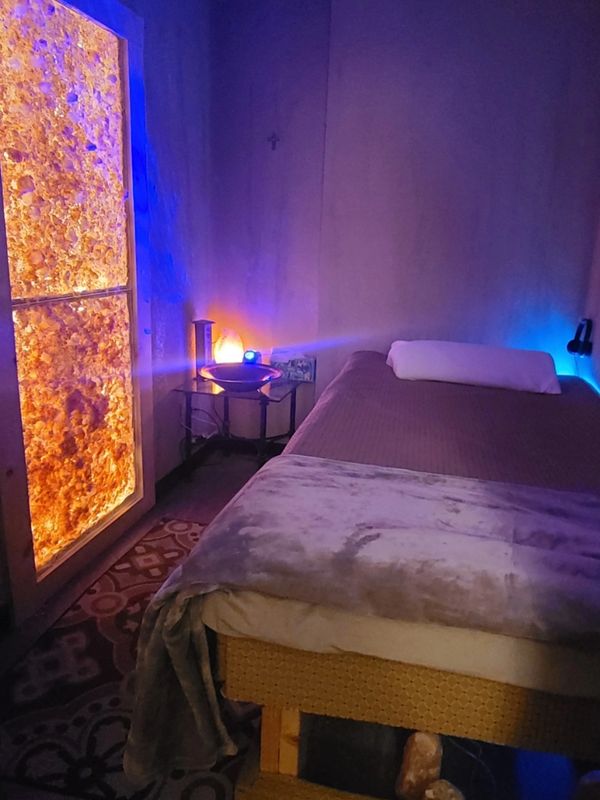 There is limited seating which includes chairs, a salted floor, and cushions. The floor has over 6,000lbs. of Himalayan Salt which will add to grounding & meditative vibration of the session.